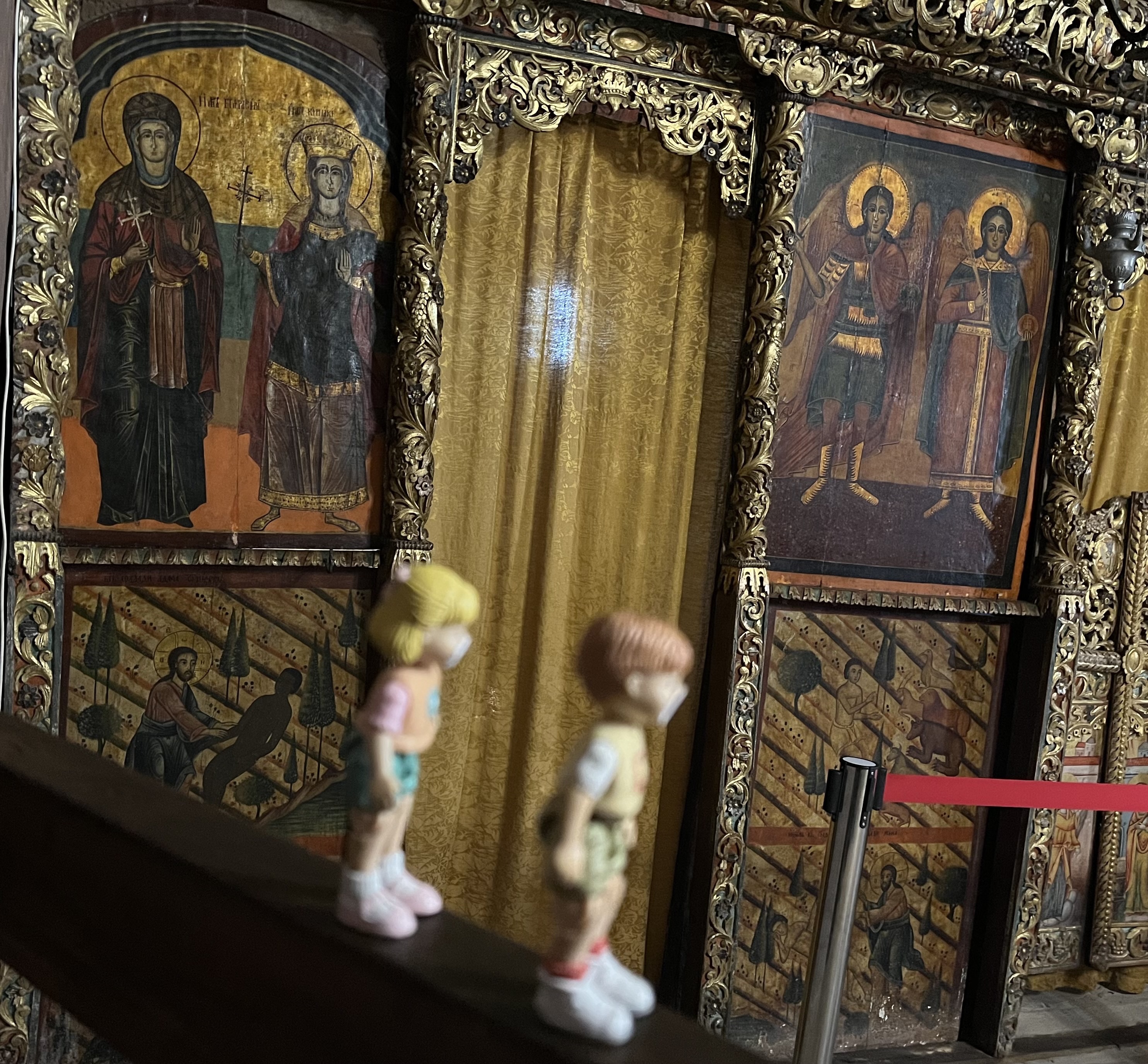 Next we walked a few blocks along the village streets to the Church of the Nativity. It was built in the 1600s and is the oldest church in the village. It looks very small and almost like a house on the outside, only the small wooden cross up at the peak of the roof let us know we were at the church. But inside it has beautiful fresco paintings all over the walls and ceilings with many depicting the holy nativity.