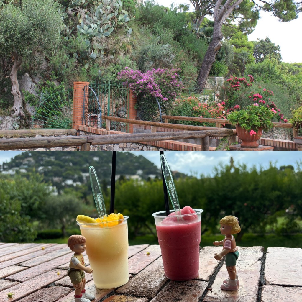 As we continued on we came across a gravel pathway leading to lovely terraced gardens, called Giardini di Augusta, with flowering trees and views of both the sea and Capri’s houses. As we left the garden we came to a little kiosk along the pathway selling granitas, and just had to try them – so yummy and refreshing!