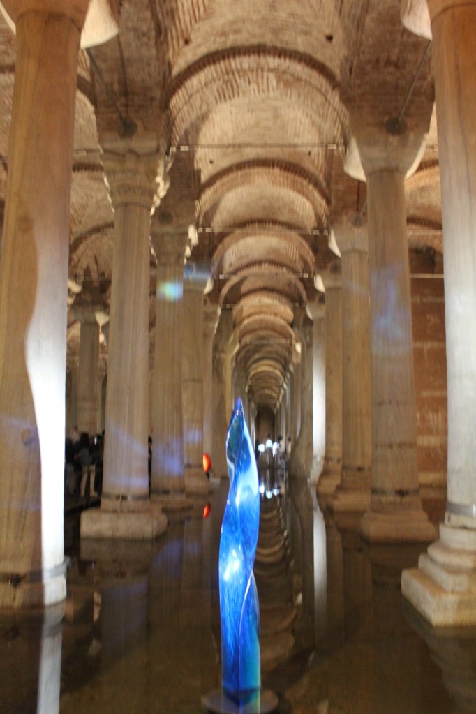 While touring in Istanbul we heard about a Roman subterranean cistern built to provide water for the Topkapi Palace. We went down to take a look at it. It is amazing, and so hard to believe that building something like this in the 3rd or 4th centuries was possible. We learned that it took about 7,000 slaves to build it and it’s so big, about 9,800 square meters and can hold about 80,000 cubic meters of water, gathered from rain.